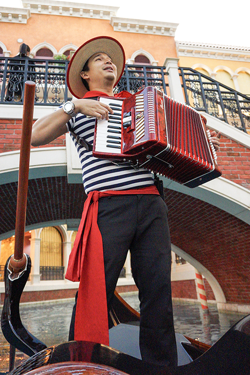 的可以坐一次試試,部分旅遊網的團購票更實惠。有三條線路可以選擇。當天提示等船大概45分鐘,一程15分鐘的樣子,登船後工作人員會給拍合照,下船後會賣300MOP(據説)一張,如果不想要可以一開始拒絶拍照。那天我選的是大運河,上船之後船夫會先讓你拍一下照片,然後把船掉頭,搖一會兒製造下氣氛,問問你從哪裡來,不論說中國哪裡都會回so far(因為假裝在威尼斯),然後開始演奏樂器(吉他、手風琴等),船夫一般唱歌都比較好聽,會向岸上橋上遊客打招呼,也會跟乘客聊天活躍氣氛,到達中段會減慢速度停下來唱首sole mio之類的意大利民歌