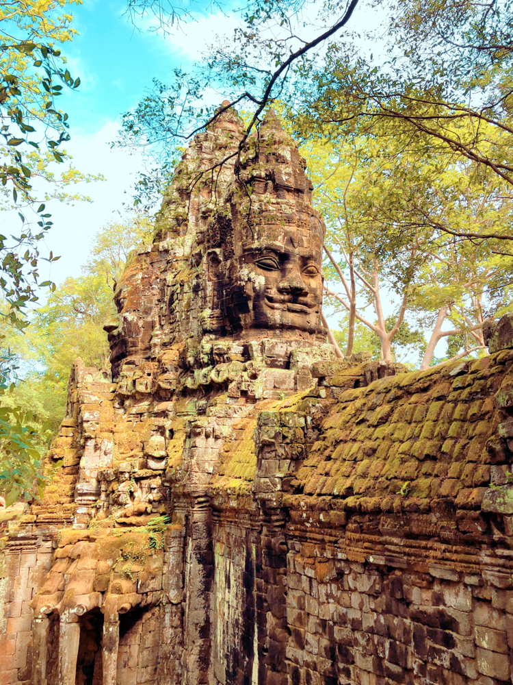南門是保存得最好的一個門,上面的四面像代表了喜怒哀樂,不過看起來好像都是在笑的